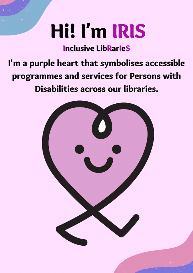 IRIS, which stands for “Inclusive LibRarIeS”, is a purple heart icon that represents accessible programmes and services for persons with disabilities and reflects the inclusive offerings available throughout NLB libraries.