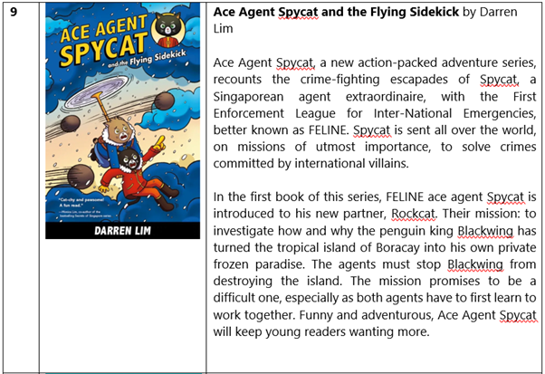 Subscribers receive a monthly selection of eight English children’s books, which include a variety of fiction and non-fiction books. Our librarians have selected the books which will appeal to a broad range of interests across two age bands, 4 to 6 and 7 to 9. This includes fiction & non-fiction titles, and books by Singaporean authors. See below for the highlights of our selection!