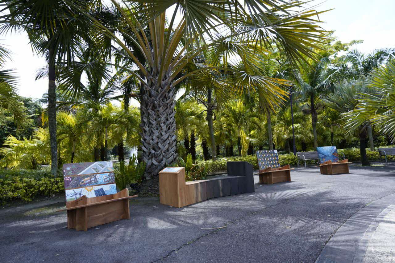 Besides the Sustainability Showcase, “Parks at Nodes” also features 16 Sustainable Benches. These benches are sustainably-produced with recycled wood from a West Indian Locust (Hymenaea courbaril) tree from Cornwall Road and a Senegal Mahogany (Khaya senegalensis) tree from Pasir Ris Park. 14 benches were adopted and painted by students from seven Secondary Schools, based on their creative interpretations of NLB’s sustainability-themed e-resources. These vibrant benches will make their way back to the campuses of the participating schools after their deployment at the parks and gardens.
