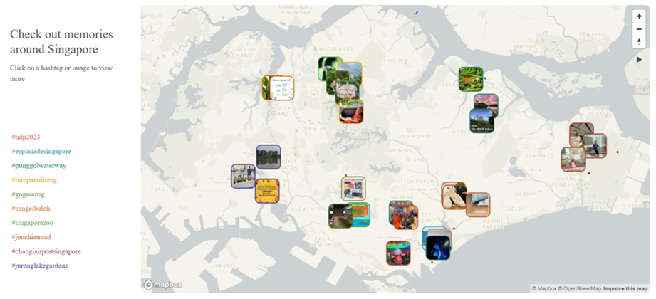 Glue is a live visualiser that presents a dynamic composite of Singapore, past and present, through photographs, captions and bite-sized content from individuals and institutional sources. This can be geo-based or theme-based. It can be populated through: (a) hashtags (e.g. #SgMemories), (b) user submissions on the Glue or from any other linked platforms, and (c) curated institutional sources, including those from NLB’s collections. The visualiser can be accessed both on-the-go (through a web interface) as well as in a phygital form at public spaces, including libraries and museums. The shape of the visualiser can also be adapted to be visually stunning, e.g. as a map of Singapore. At the libraries, it can be the nexus of community information. For example, it can present the heritage and memories of the area as well as community happenings. Through Glue, users can better understand the places, including hidden gems around them, or even connect with individuals with like-minded interests. NLB is launching the geo-based prototype online and at a number of public libraries in Q1 2024. |
