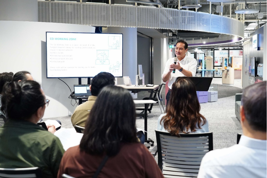 Photo 1 – Senior Minister of State for Communications and Information, Mr Tan Kiat How, gave a welcome speech at the co-working zone next to Launch.