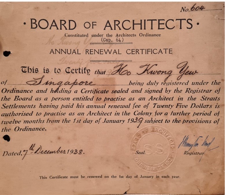 Annual renewal certificate, Ho Kwong Yew, 1938 |