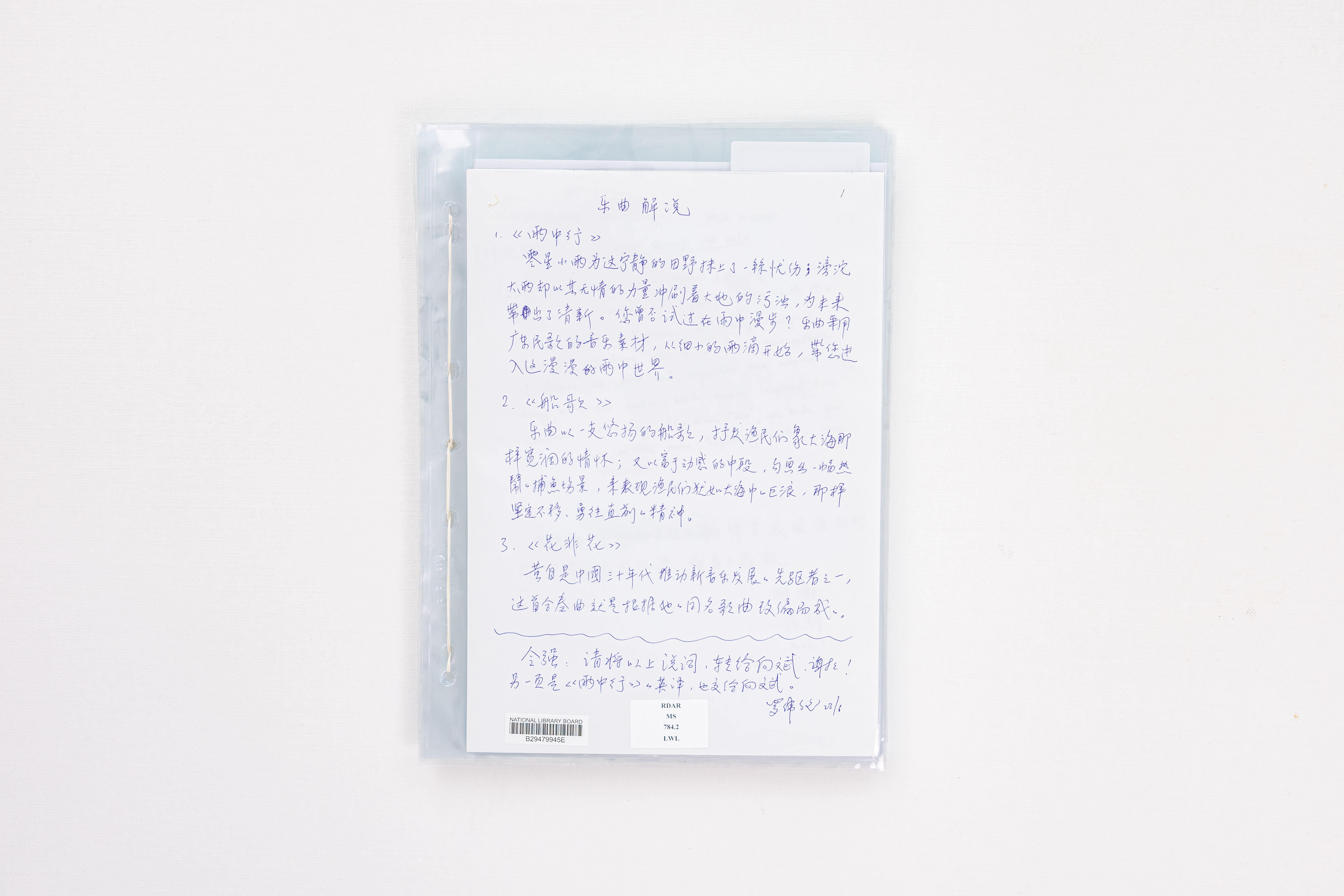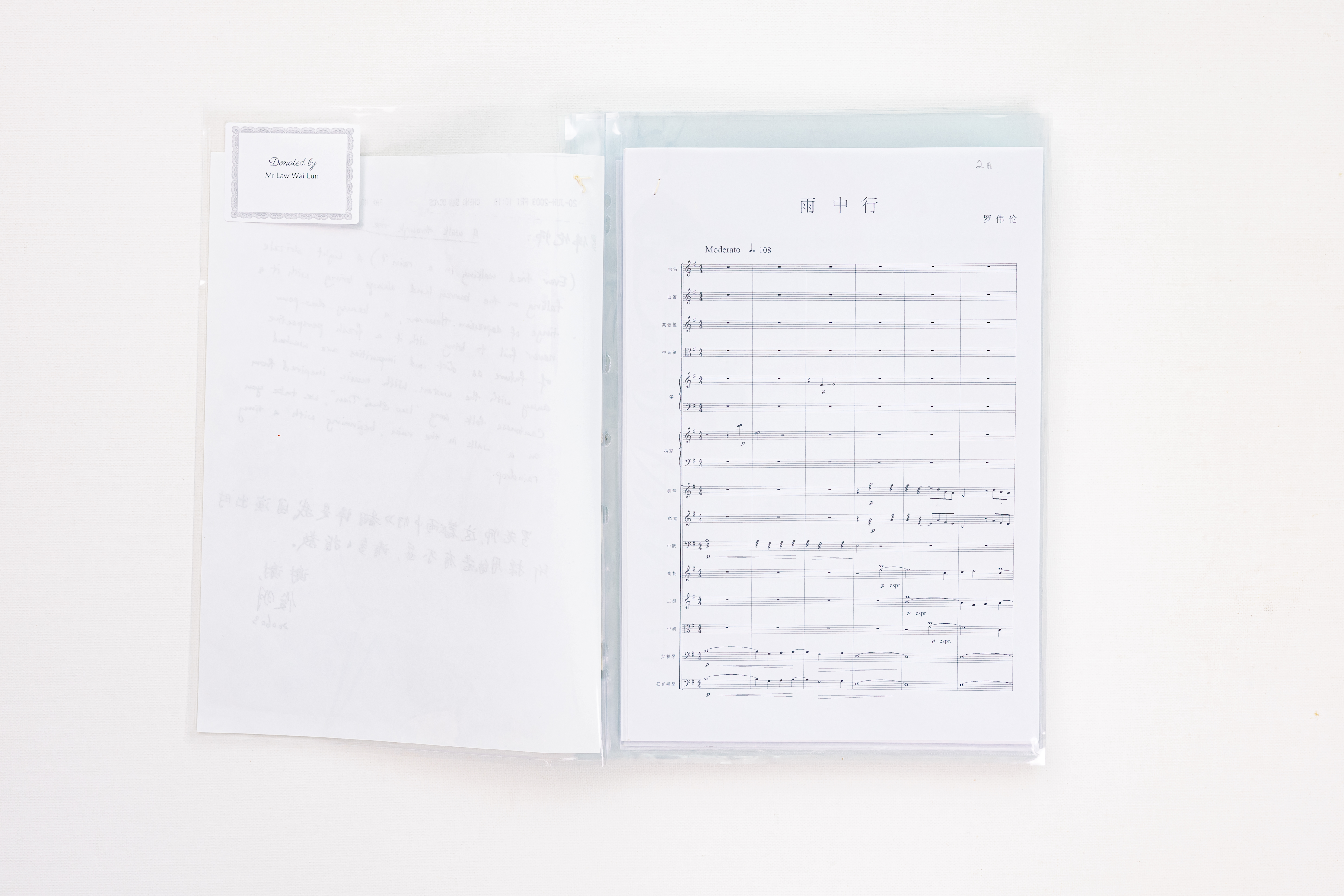 Shown here is the score for “A Stroll in the Rain”. Inspired by a Cantonese folk tune, it was commissioned by the National Arts Council for the 2002 National Chinese Music Competition. The piece begins like a light drizzle leading to a downpour that washes away the impurities of the earth, signifying a renewed future. The donated score comes with a synopsis of this and two other pieces, handwritten by Law.