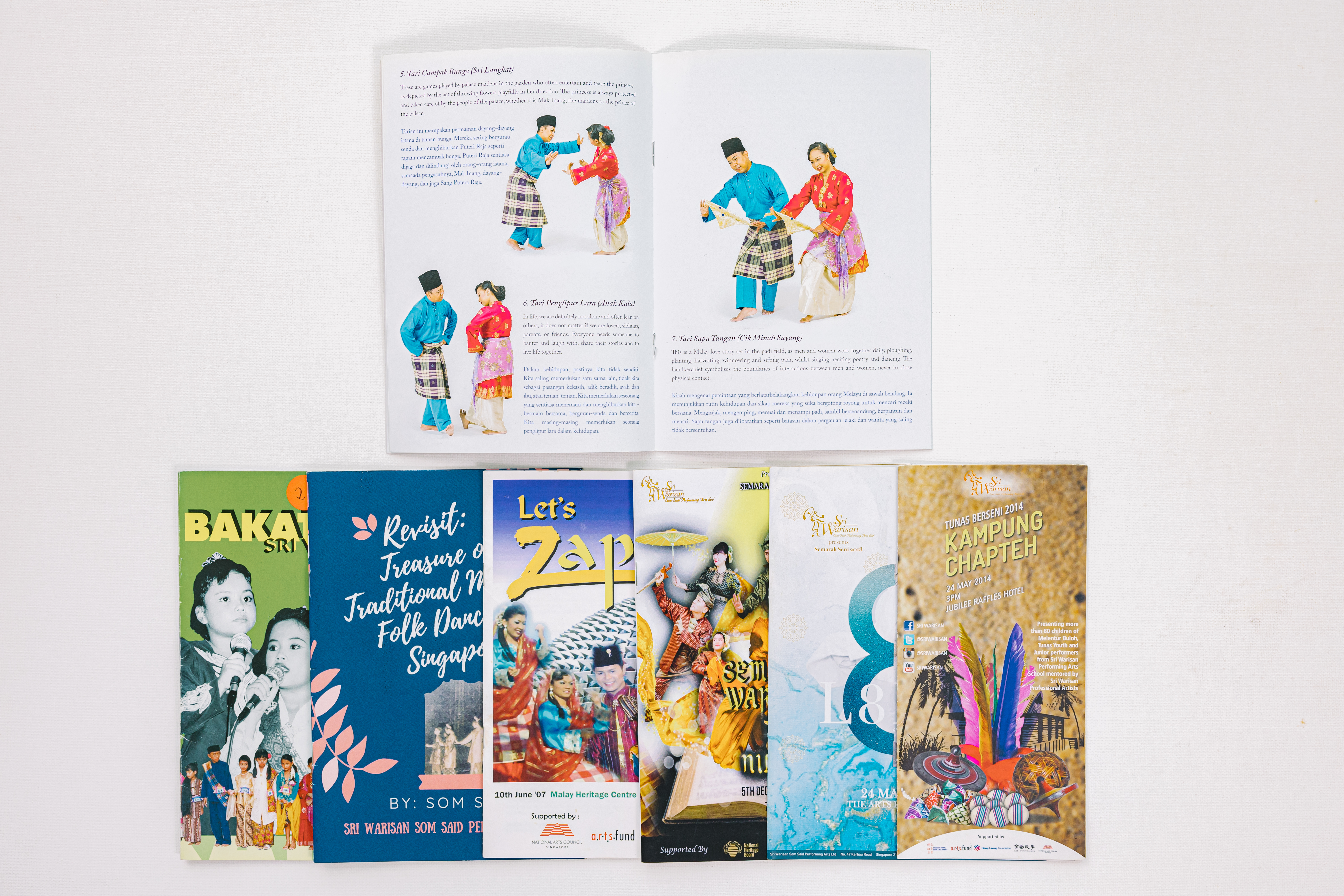 This is a selection of brochures and leaflets from performing arts productions by Sri Warisan over the years. The productions reflect the creativity of the organisation in promoting Malay traditional dance, showcasing a wide variety of performing traditions including wayang kulit (shadow puppet theatre), zapin (a traditional Malay dance with origins in the Hadhramaut region of Yemen) and serampang 12 (a northern Sumatran couple dance performed with 12 steps).