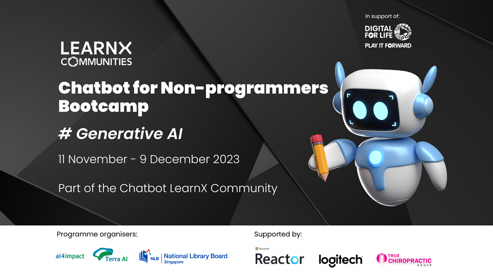 The Chatbot LearnX Community is a learning group facilitated by AI4IMPACT. In this community, like-minded learners develop skills in creating chatbots that are fun and useful in our daily lives! For age 15 and above. No programming experience needed!