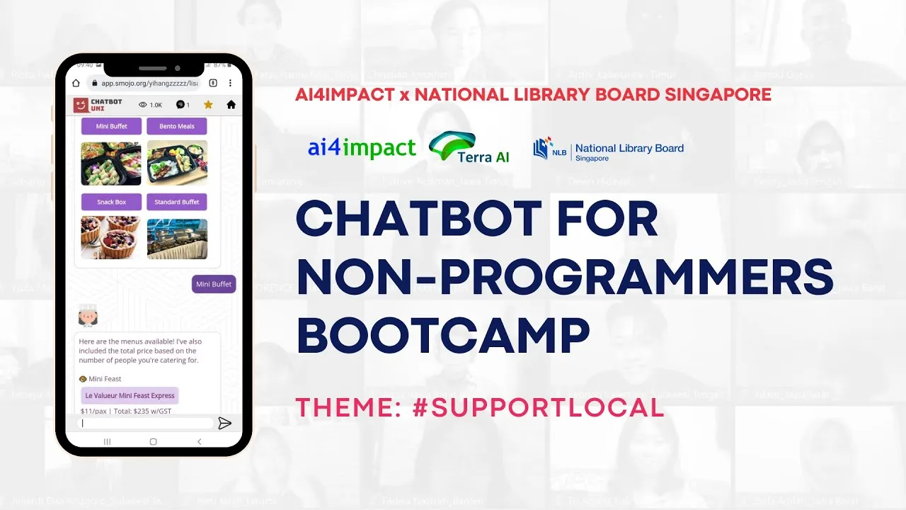 In a 5-week bootcamp and competition (28 January to 25 February 2023), participants learned to build useful and meaningful chatbots. NLB x AI4IMPACT partnered with local sustainability-related companies – Confetti Snacks Inc (https://confettisnacks.com/), ChopValue Singapore (https://chopvalue.com.sg/), and Urban Origins (https://urbanorigins.sg/) – to provide problem statements towards producing chatbots that address real-life business needs!