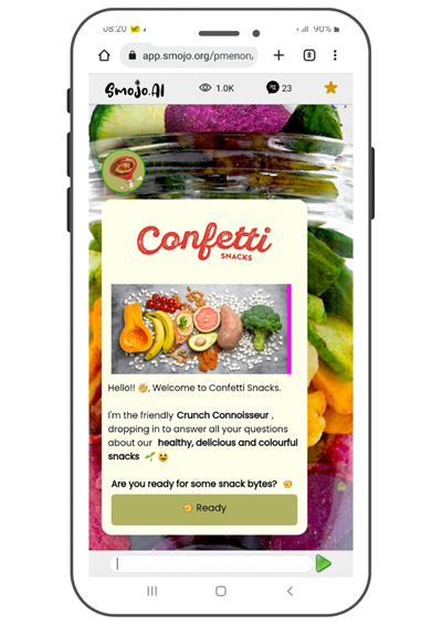 Meet Snackbot, your guide to Confetti Snacks’ veggie chips. Learn about their tasty products and get fun, personalised snack recommendations from this crunch connoisseur chatbot!