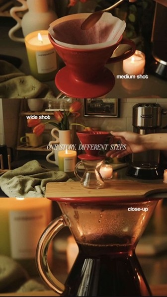 Consider the story you are trying to tell: are the 3 shots steps in preparing a meal? Do some shots establish the context or scene, while others provide detail or how the experience feels from your first-person perspective?