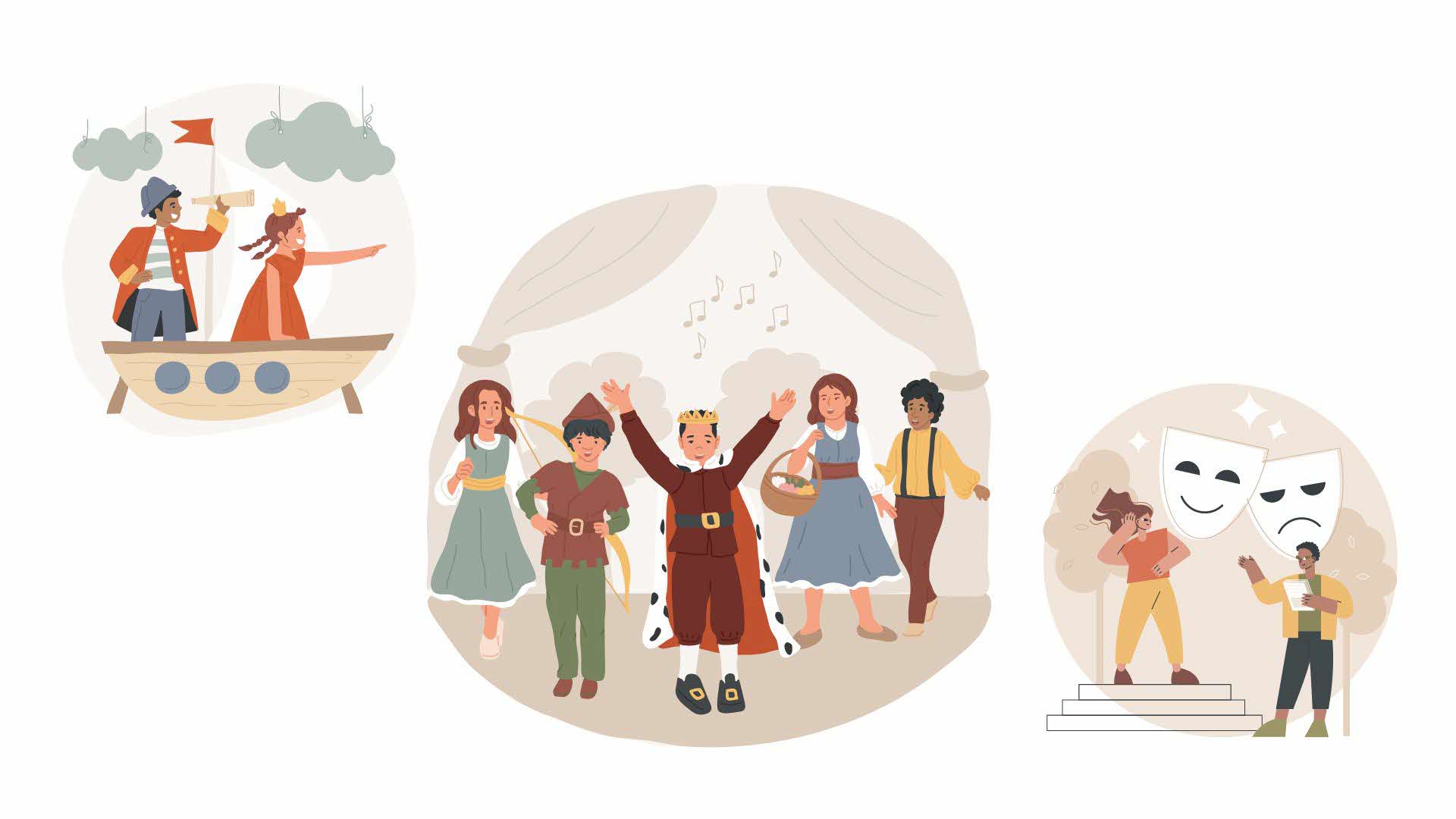 Make simple costumes and props using paper, cardboard, and colouring materials. Use them to act out different characters and encourage your child to do the same.