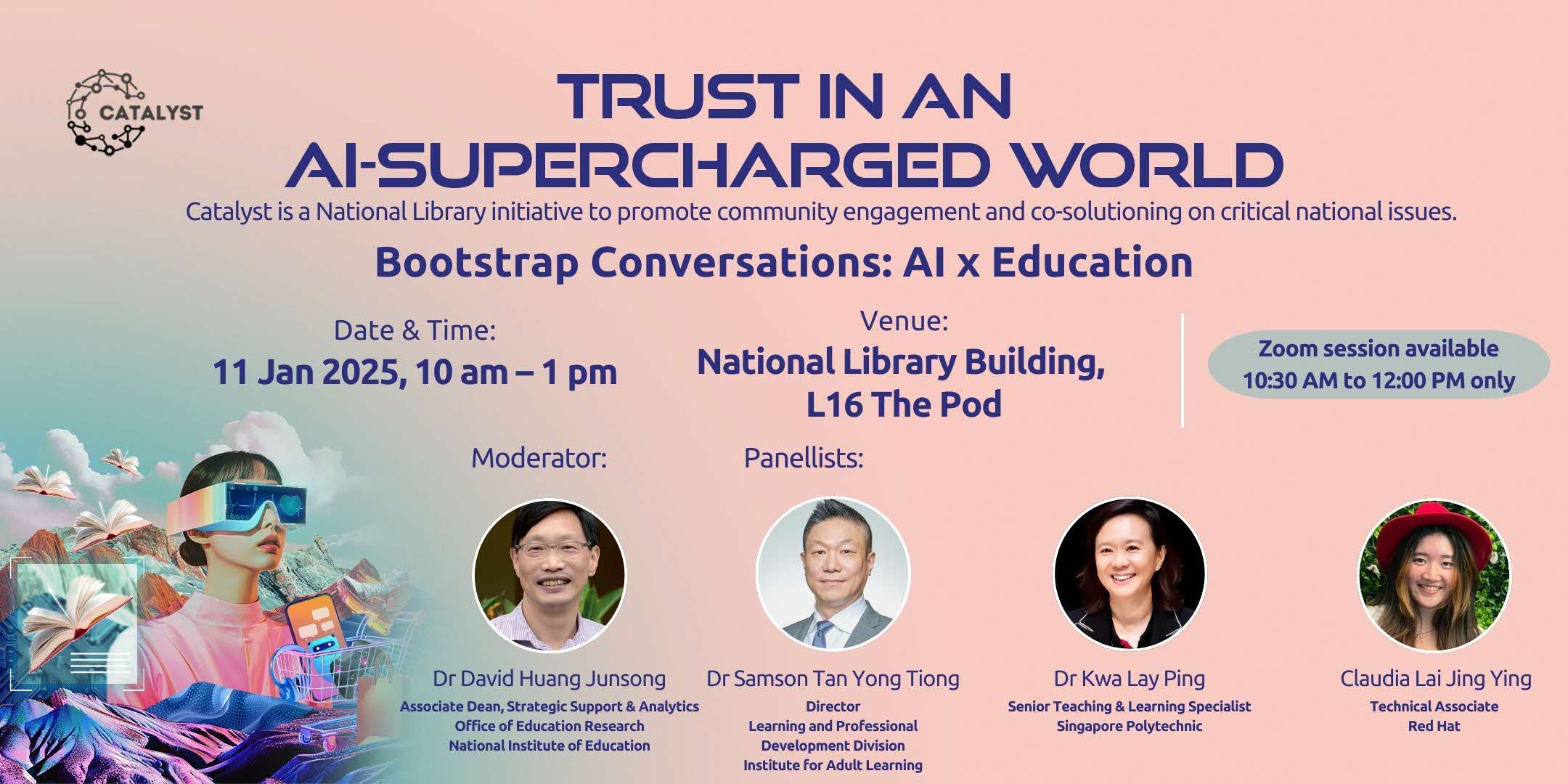 Join us in the first edition of Catalyst, jointly organised by the National Library Board (NLB) and Singapore University of Technology and Design (SUTD). Focusing on the trending topic of responsible AI, get ready to expand your mind, skills and networks through panel conversations, ground-up solutioning and implementation to create real-world impact with like-minded peers.