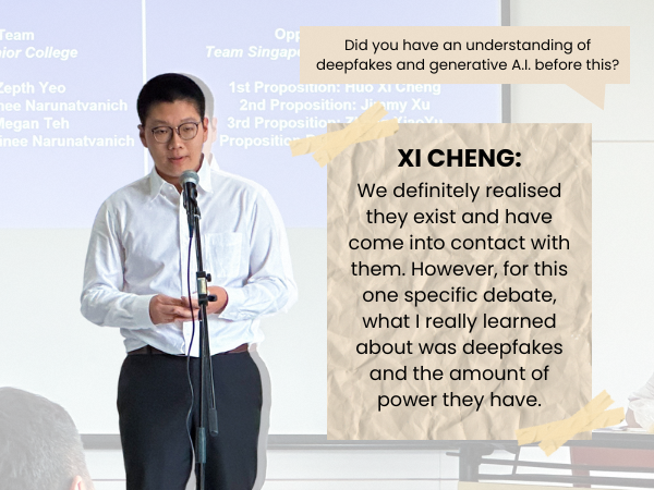 Xiao Yu: For us, at the start, our knowledge of generative A.I was very cursory. We thought of it as —oh, this is a new thing that exists and there’s a trend of companies investing in it and trying to develop it. For this debate, though, we really went deep into the mechanism of how deepfakes work and how it impacts different stakeholders. We looked at whether the government is effective in regulating generative A.I., and who the stakeholders are in the industry.
