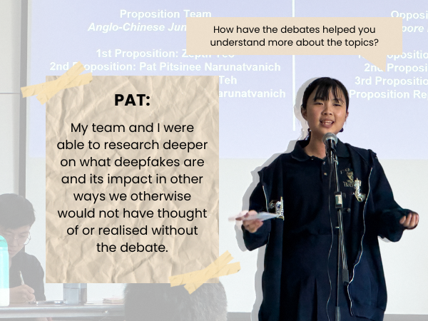 In this article, we talk to four students who participated in the RTBS Youth Debates series to learn more about their experience. Huo Xi Cheng and Zhang Xiao Yu, part of the Ministry of Education Debate Training Programme, are both from Hwa Chong Institution. They took on the role of the opposition during the debate. On the other hand, Pat Pitsinee Narunatavanich and Verity Yee are ACJC students, with Pat arguing as the proposition for the motion on deepfakes and Verity having participated in a previous debate on abolishing the retirement age in Singapore.