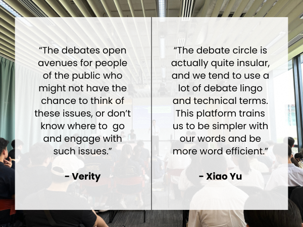 Verity: Oftentimes, the topics that we see in debates are things we see in society or things that we see while scrolling through social media. Or they come up in conversations we have with our friends. Whether we take the steps to go and conduct our own research is a different thing. So, I think these debates really provide us that avenue to research, have proper conversations and really hear about the different perspectives people have on these topics.