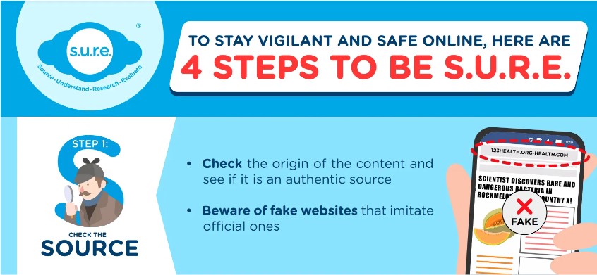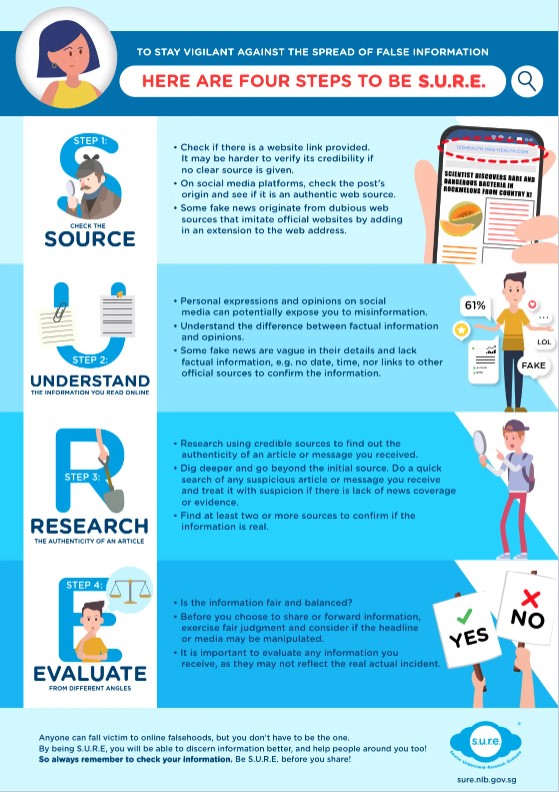 Learn how to safeguard yourself and others against online falsehoods by using the National Library Board’s S.U.R.E. steps HERE.