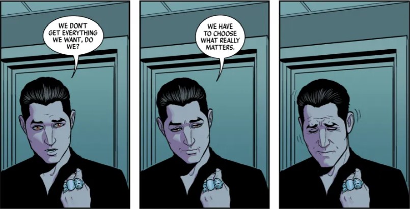 These three panels from The Wicked + The Divine, an Eisner-award-nominated comic series which ran from 2014-2019, demonstrate the power of images to convey information. The panels convey not only factual information – telling us where we are and who is speaking – but emotional information as well. The sharp angles and minimalist lines of the background create a feeling of harshness and emptiness; the colour palette of washed-out greys, blacks, and blues suggest both sadness and sterility. And, of course, there are the facial expressions and body language of our speaking character, Cameron, which are amplified and emphasised by the way he dominates each panel. These images form a vivid picture of his internal landscape, and his shift from surety to wry resignation and, finally, to a quiet breakdown.