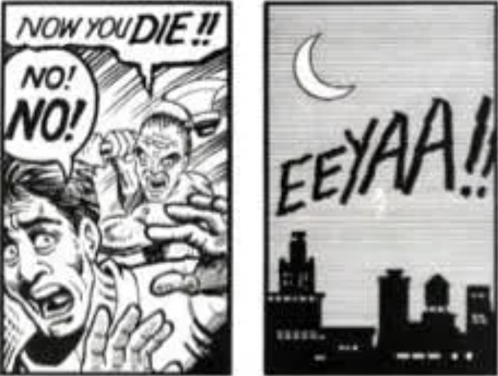 In this example from Understanding Comics, we see two images: one of a man being chased by an attacker with an axe, and one of a city skyline with a scream written over it. A reader looking at these images easily and naturally draws certain conclusions: that the scream in the second image belongs to the attacked man in the first, and therefore that he has been caught by his attacker and hurt, or even killed, with the axe. Yet these conclusions are never stated to us – we never see the man getting attacked. They are simply suggested by the way these pieces of information are placed. Our brains have filled in the gaps, and created the story, on their own.