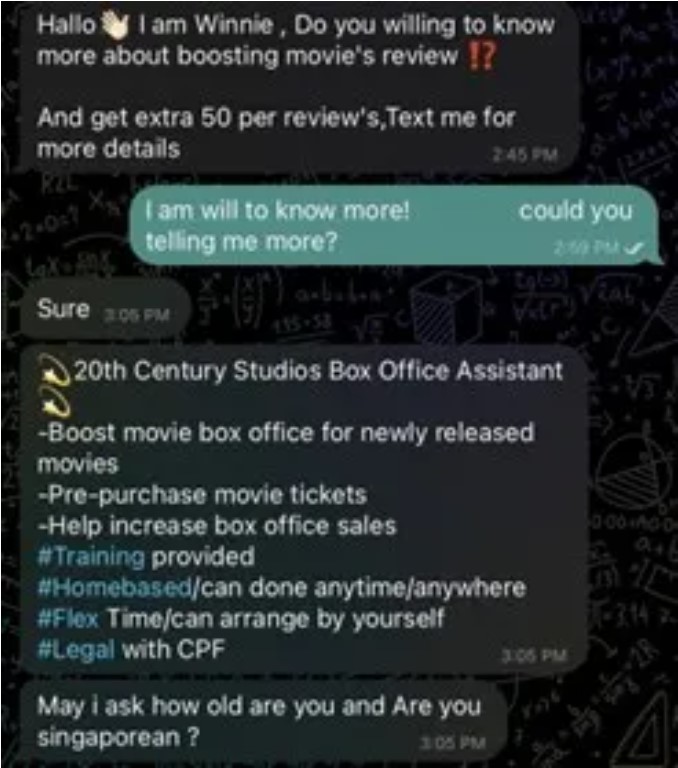 I was in the middle of a group discussion for my university project when I received an unsolicited Telegram message from someone named Winnie. “Hello, I am Winnie, Do you willing to know more about boosting movie’s review!? And get extra 50 per review’s,Text me for more details.” I knew it was just another job scam message because of Winnie’s poor command of English and the fact that I was offered a job that I never applied for. However, I was very curious about how scammers operate. Confident that I would never fall for such a scam, I responded with a similarly-worded message. “I am will to know more!” That was the start of how I nearly got hooked into a scam.