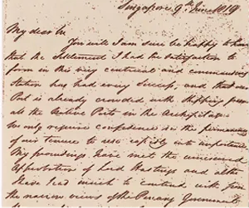 This letter was written during Raffles's second brief sojourn in Singapore in June 1819. In this letter to his business agent John Tayler of London, Raffles displays his optimism and pride in the settlement he founded.